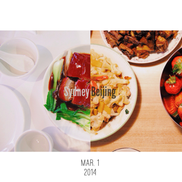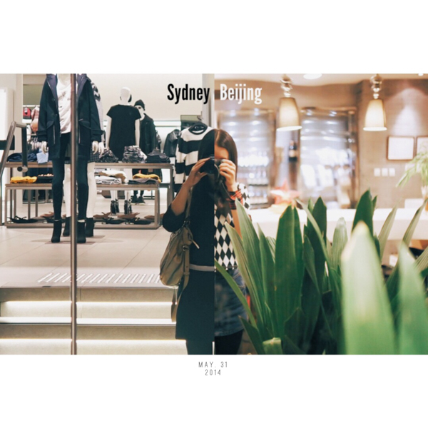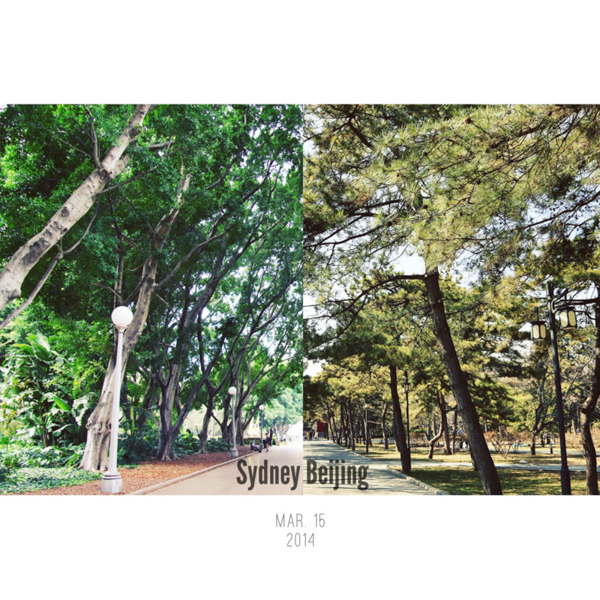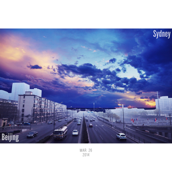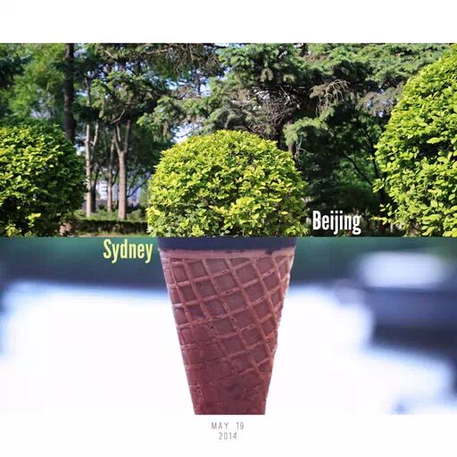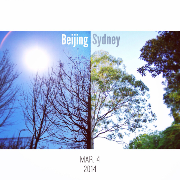 2月份一个帝都常见的重度雾霾天,我恰好正跟远在悉尼的死党Dora微信聊天,沮丧地给她直播了一张灰不拉几的天,她马上回我一张晴空万里的窗外,一如既往地打击并调戏我,继而提议说:我们可以合拍个差不多的场景拼一起呀。于是便有了如下的这第一张: